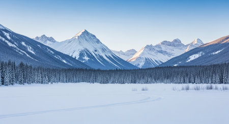 A pristine winter scene showcases towering peaks blanketed in snow, enveloped by lush evergreen trees, all beneath a crisp, cloudless azure sky.