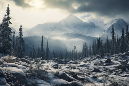 Winter landscape showcases snow-laden evergreen trees and majestic rocky mountains, shrouded in mist, evoking a peaceful and serene ambiance in nature