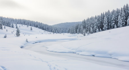 A winding river flows through a snowy forest, surrounded by tall, snow-covered pine trees. The sky is overcast with gray clouds, creating a serene and peaceful atmosphere.