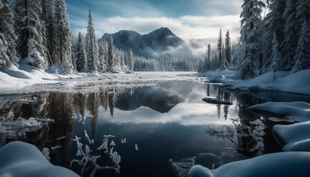Tranquil scene of frozen mountain range reflects beauty in nature generated by artificial intelligence