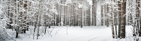 Pathway through snow-covered pine tree forest in a blizzard. Evergreen fir trees close-up. Atmospheric landscape. Idyllic rural scene. Winter wonderland. Pure nature, climate, seasons. Panoramic view