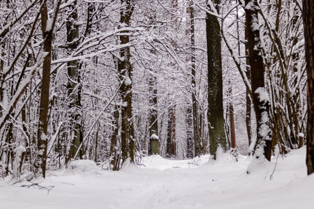 Beautiful winter forest with a beaten path close up