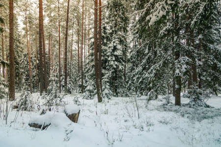 Winter forest. Landscape of winter forest on a sunny day. Snow-covered trees and Christmas trees in the forest. Branches under the snow. Bad snowy weather cold day.