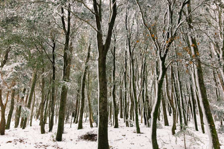 Snowing, holidays and environment concept - Winter abstract background, beautiful trees covered with snow, Christmas holiday nature backdrop, snowy cold season weather in forest, landscape design