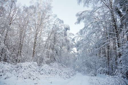 Snow covered trees in the winter forest with road
