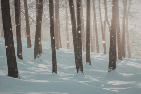 A tranquil winter scene featuring a snow-covered forest with tall, slender trees and sunlight piercing through the misty atmosphere, creating a sense of calm and peacefulness.
