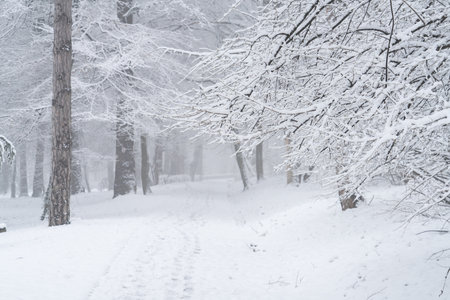 Snow covered winter park during snowfall