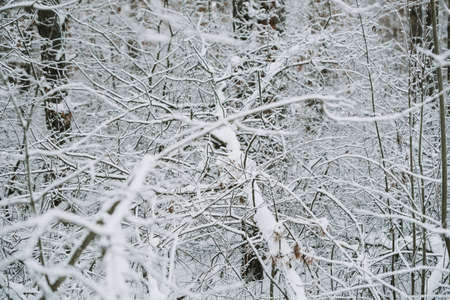 Trees and branches covered with snow and hoarfrost in a city park in the morning in cloudy weather. Winter season, january. For design.