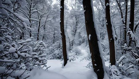 A snowy forest path with trees covered in snow, showcasing a peaceful winter landscape.