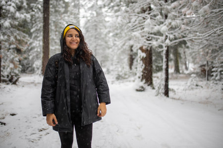 happy brunette woman walking in winter park under snowfall