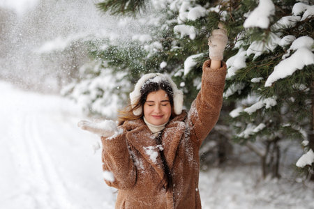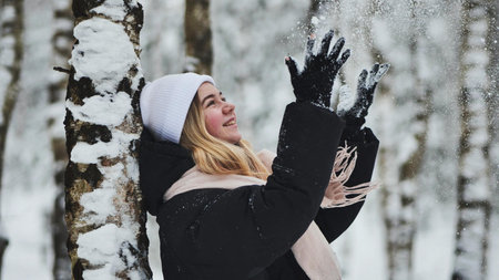 Happy beautiful girl in knit hat making fun with snow while walking in winter forest