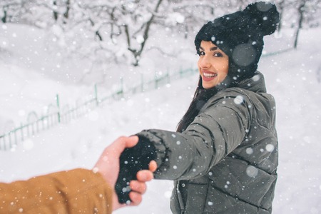 Happy Young Couple in Winter . Family Outdoors. man and woman looking upwards and laughing. Love, fun, season and people - walking in winter park. Stand and hold each others hands