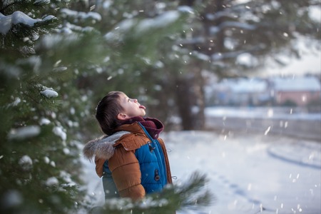 Cute little baby who catches snowflakes mouth in winter day. Little toddler boy playing with snow in winter
