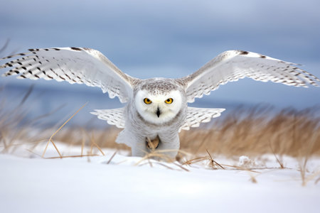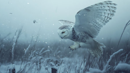 snowy owl diving towards a snow-covered field, targeting its prey, created with generative ai