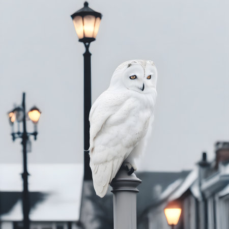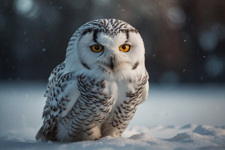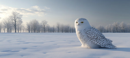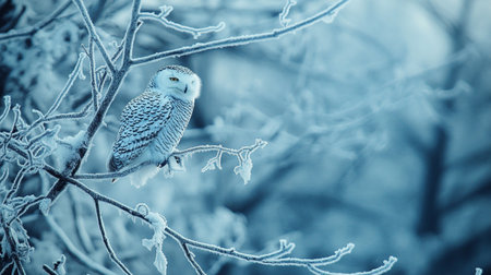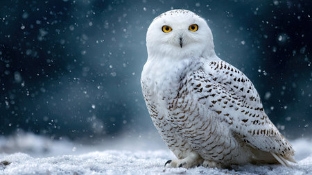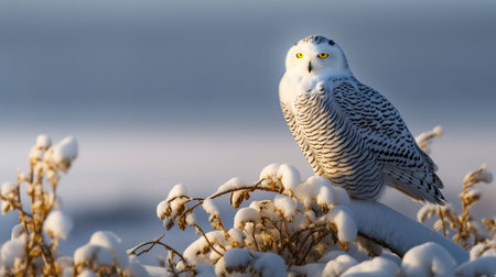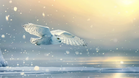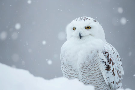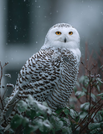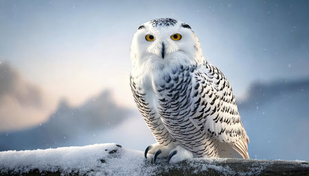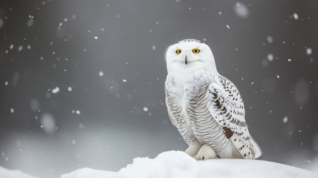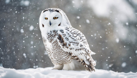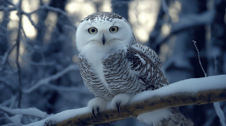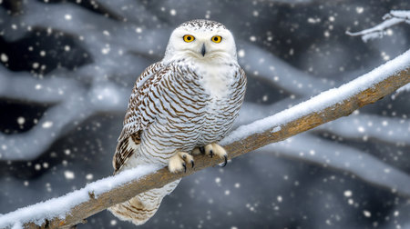 A captivating snowy owl sits peacefully on a snow-laden branch, surrounded by a serene winter landscape. Gentle snowflakes fall around, creating a tranquil atmosphere.