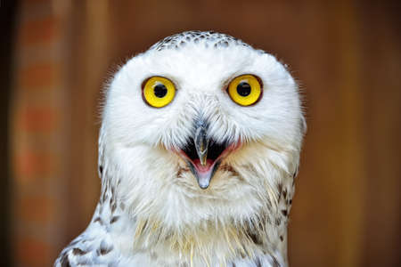 Happy smiling white and wild snowy Owl, yawning with closed eyes in the morning, close up head shot