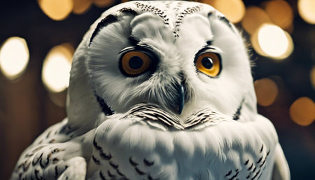 A close-up shot showcases a snowy owl, its white feathers contrasted by a dark background. The bird's piercing yellow eyes and black beak are prominent. This image, with its soft focus and natural lighting, could be used in various commercial or editorial projects, highlighting the beauty of wildlife.