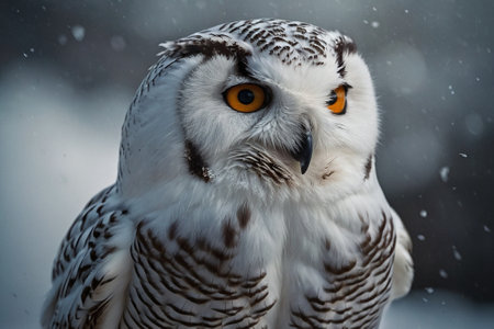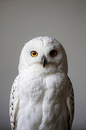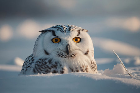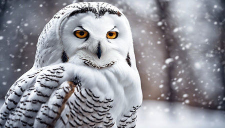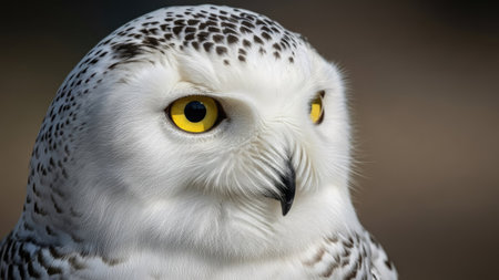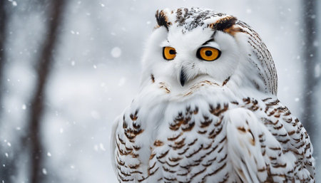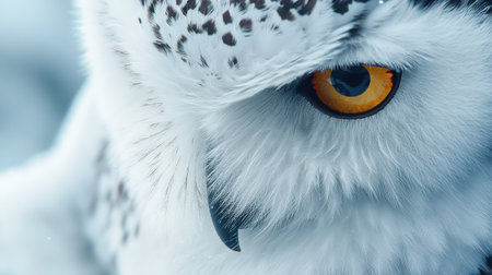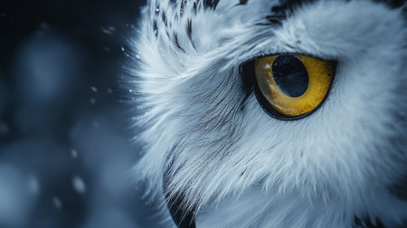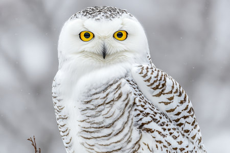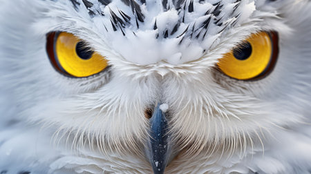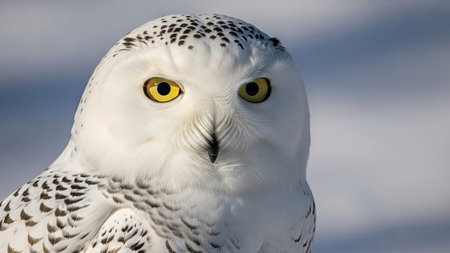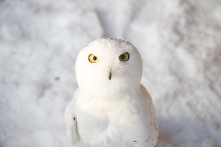 A close-up view presents a snowy owl, showcasing its white plumage and contrasting yellow eyes. The composition highlights the bird's detailed feathering. The soft focus background suggests a snowy outdoor environment. This image is suitable for various commercial uses, including illustrations and educational content.
