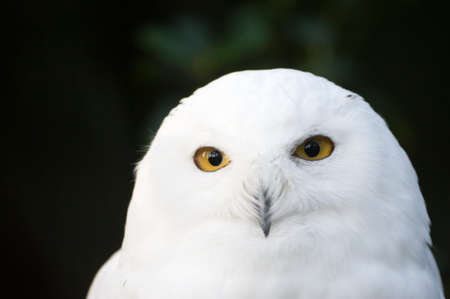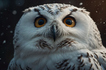 AShallow focus of a white snowy owl in the dark background