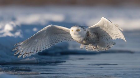 Majestic Snowy Owl in a Serene Winter Landscape, Gliding Over a Snow-Covered Arctic Terrain