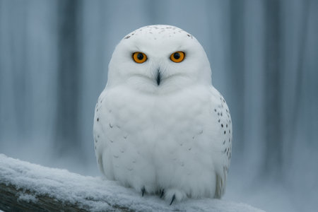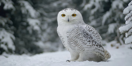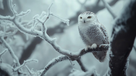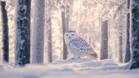 Snowy owl perched in a frosted forest, captivating viewers with its stunning beauty and grace.