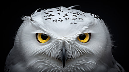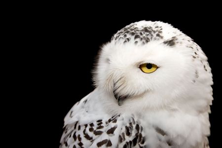 Portrait of a snowy owl on a black background close-up
