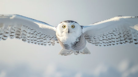 Snowy owl approaching the camera. A snowy owl spreads its impressive wings and flies directly towards the viewer, against a bright background.