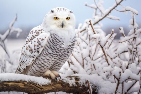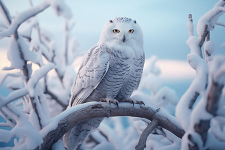 Majestic Snowy Owl Perched Gracefully on a Snow-Covered Branch in a Beautiful Winter Wonderland