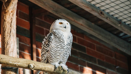 Snow owl standing on a perch in a zoo enclosure