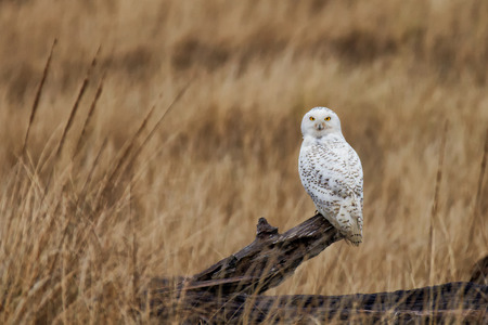 A snowy owl on a log in tall dry grass