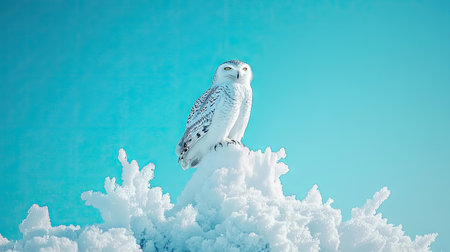 Snowy owl is perched atop a mound of frosted snow against a vivid azure sky. The owl is centered in the image, and the snowdrift is detailed with intricate icy formations. The backdrop is a bright, clear, sky of a vibrant turquoise-blue.