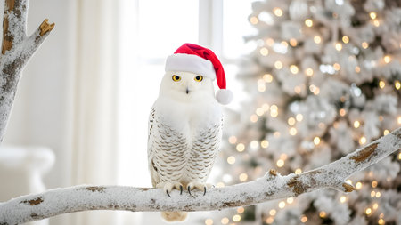 Snowy owl with santa hat sitting on a branch in front of a Christmas tree