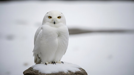 A majestic snowy owl is captured resting atop a snow-covered rock. The bird features bright yellow eyes, against a backdrop of white snow. The image showcases the owl's feathers with a soft lighting suggesting an outdoor environment. This image could be suitable for various editorial and commercial applications.