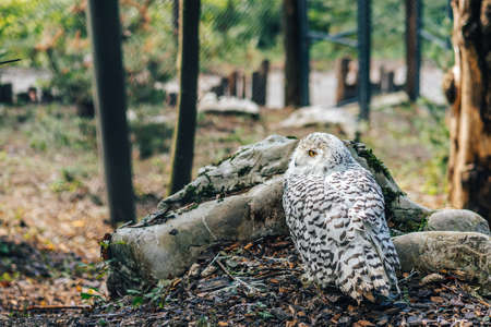 Close up detail shot of snowy owl (Bubo scandiacus) sitting on a stone or ground full of fallen leaves. White owl looking to the camera.