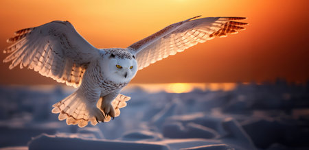 An AI generated illustration of A majestic white owl gliding against the backdrop of a golden sky, illuminated by the setting sun