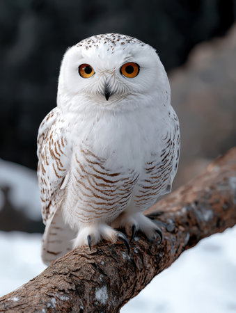 A majestic snowy owl is captured with remarkable detail, showcasing its striking black and white plumage. The image depicts the owl perched on a branch, set against a blurred background, possibly a winter landscape. The composition focuses on the bird's posture, with visible textures. Suitable for illustrating wildlife themes and various editorial applications.