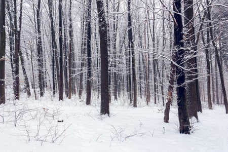 Winter view of the trees in the deep forest.