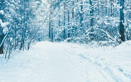 Ice road through snow-covered forest (park) after a blizzard on a clear day. Trees covered with hoarfrost. Winter wonderland. Idyllic rural scene. Nature, seasons, ecotourism, christmas vacations