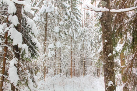 Frozen winter forest with snow covered trees. outdoor