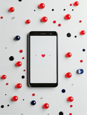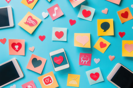 A smartphone sits on a clean table, encircled by vibrant icons of notifications, likes, and comments, depicting online interactions.