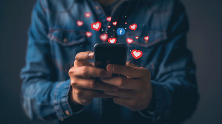A man interacts with his smartphone, surrounded by animated likes and hearts from social media platforms during the evening hours.