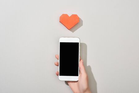Top view of girl holding smartphone with blank screen by heart shaped paper on grey background