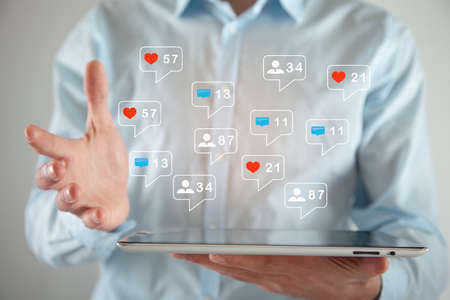 Concept with notification icons of like above smartphone screen,Social media interactions on mobile phone, a man's right hand holding device, internet digital marketing.