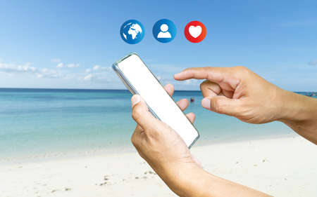 a human using a smartphone with Social media. The concept of living on vacation and playing social media. Social Distancing, Social media and digital online concept, Traveling concept.