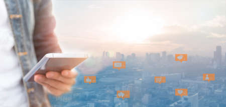 hands of man using smart phone with notification icons of love, like, message, Social, media, Marketing concept, Social media and digital online concept.