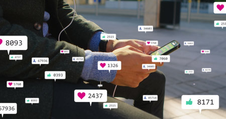 Image of social media icons and numbers on banners over man using smartphone. global networking, social media, technology and digital interface concept digitally generated image.