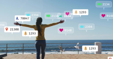 Concept with notification icons of social media on smart phone. Woman's hands holding her phone with notification icons of love, like, message, chat, comment and shopping above smartphone screen.