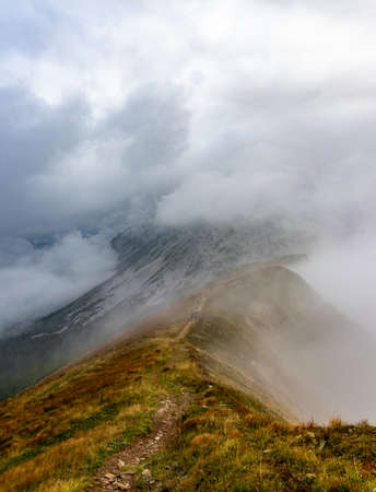 Hikers going up a mountain trail in the styrian mountains in austria, hiking trail, sport, misty mountain early in the morning, ascending