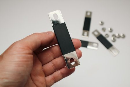 Hand holding copper bus bar for Lithium Phosphate prismatic cell battery. Battery terminal bar.