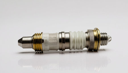 A high-quality close-up image of a spark plug showcasing fine details, reflections, and metallic textures, ideal for automotive themes.